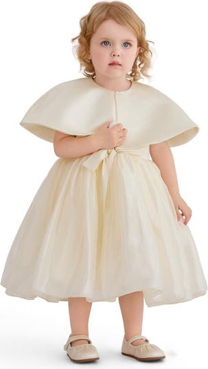 A refined satin dress designed for special occasions, blending timeless charm with childlike grace. The voluminous skirt and delicate cape overlay create a look that feels both regal and sweet.