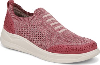 A knit upper with tonal rhinestones adds contemporary appeal to a slip-on sneaker grounded by a cushioned footbed and chunky platform sole.