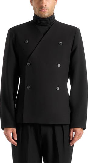 A kimono-inspired fastening introduces a distinctive edge to this double breasted piece, blending tailored precision with modern design. Crafted from structured fabric, it creates a clean, defined silhouette enhanced by shoulder padding that adds shape and balance. Marble feature buttons offer a bold, refined accent, while a smooth satin lining ensures ease and comfort throughout.