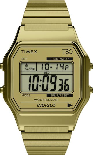 An easy-to-read digital display complete with INDIGLO® lighting boasts the date, an alarm and stopwatch capabilities within a sleek, retro bracelet watch.