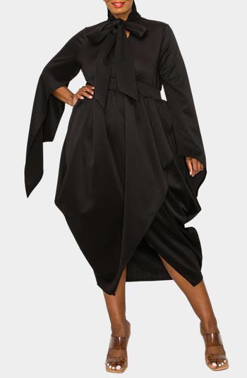 Deliver drama for dress day in a cape-sleeved dress designed with a sculptural shape and a showy bow at the neck.