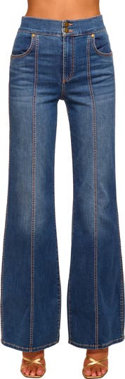 Create a stunning silhouette in these stretchy, vintage-inspired jeans made with extralong wide legs and figure-elongating seam details.