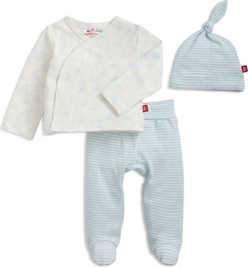 Bundle baby up from head to toe in the comfort of this organic cotton set that includes footed pants, a hat and top with a signature magnetic closure for easy changes.