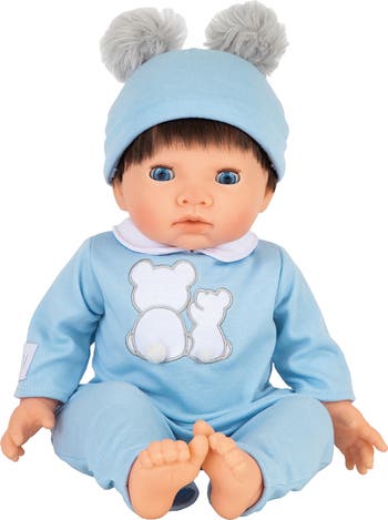 - Doll is dressed in blue one-piece garment with appliqued bear detail and cute cap.