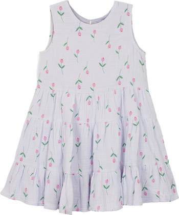 This adorable girl's dress features a soft lavender gauze fabric with sweet pink tulips. Designed with a sleeveless bodice and a tiered skirt, this dress offers a playful and stylish look. Perfect for warm-weather outings and special occasions, it combines comfort and elegance for your little one's wardrobe. Fabric Care 100% COTTON / 100% POLYESTER Machine Wash Cold | Line Dry Do Not Bleach