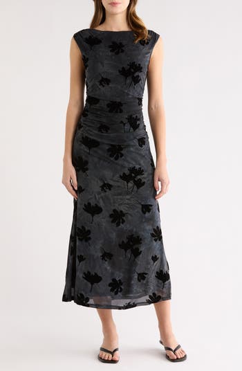 Slip into sultry sophistication with this burnout midi dress featuring subtle ruching at the bodice for a flawless, curve-hugging fit.