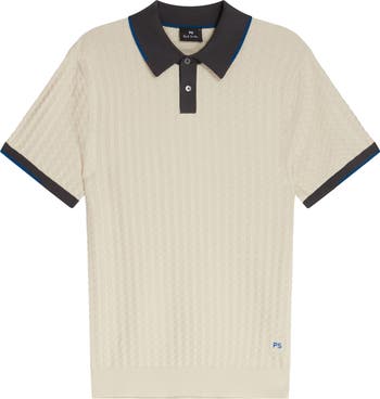 Touches of color bring signature style to an organic-cotton polo-sweater knit in an intriguing basket-weave design.