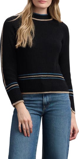 Multi-hued contrasts add interest to a rib-knit sweater framed by a mick neck and roomy raglan sleeves.
