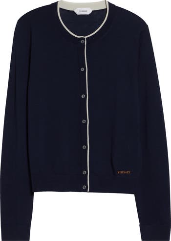 Narrow tipping highlights this classic fine-gauge cardigan expertly knit in Italy from warm wool-blend yarn and fastened with pearly buttons. Versace embroidery marks the front hem for subtle branding.
