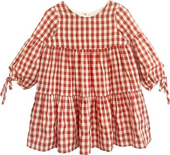 The Tis' the Season Dress is perfect for playful days and cherished memories. Its vibrant red and white gingham pattern, paired with tiered layers, creates a timeless, whimsical look. Featuring long sleeves with sweet tie accents and a round neckline, this dress offers comfort and freedom to move, making it a delightful choice for your little one?s adventures. Fabric Content & Care 50% VISCOSE 50% POLYESTER Machine Wash Cold | Line Dry | Do Not Bleach