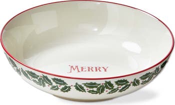 Spread holiday cheer with this festive Tis the Season Serving Bowl. Crafted from stoneware, this bowl features a classic white design with a red border and green holly leaves. The word "merry" is inscribed on the inside, adding a touch of holiday cheer.