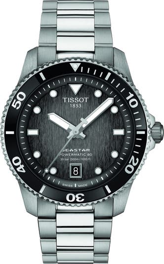 Boasting water resistance to an underwater depth of nearly a thousand feet, this Swiss-made automatic watch is built for divers and water-sports lovers. Set on a stainless steel bracelet, the high-performance timepiece also features a unidirectional ceramic bezel and luminescent markers for easy readability in low-light conditions.