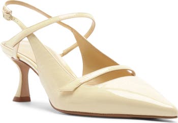 Twin straps crossing the open vamp of this pointy-toe slingback add a modern touch of elegance to a timeless pump that's made in Italy from patent leather. A low, sculptural bell heel combines comfort, style and practicality for an effortless day-to-night look.