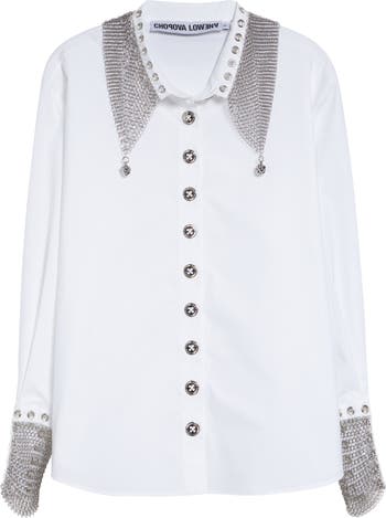 The design duo reimagines the wardrobe-staple button-up shirt as statement-making armor in this structured cotton-poplin iteration adorned with silvery buttons, charms, grommets and chain-mail trim.