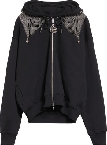 The design duo reimagines the wardrobe-staple hoodie as statement-making armor in this roomy cotton-fleece iteration adorned with silvery charms, grommets and chain-mail trim.
