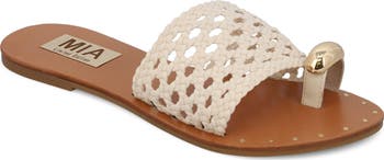 Organically-shaped hardware highlights the stylish toe loop on a minimalist slide sandal featuring an intricately woven upper for a boho aesthetic.