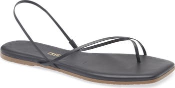 A slender slingback strap and sleek toe post detail the minimalist upper of a versatile leather sandal set on a cushioned footbed and durable rubber sole.