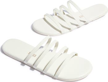 A tidy sequence of slender leather straps climbs the superslim footbed of this lightweight slide sandal in a clean monochrome design.
