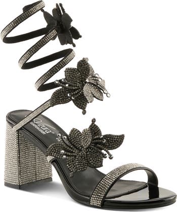 Hand-applied rhinestones and a winding ankle strap dial up the drama of this block-heel sandal ready to dazzle at your next special occasion.