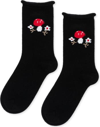A breathable blend containing merino wool and recycled-cashmere yarns keeps you feeling comfortable all-day long in these crew socks featuring an adorable toadstool accent at the cuff.