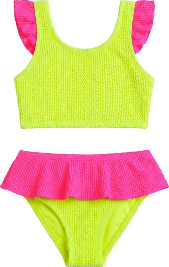 Brighten up swim time with the vibrant lime Daisy bikini, a two-piece toddler essential that's as fun as it is functional! Featuring playful ruffled accents on the straps and legs in contrasting fuchsia, plus stretchy crinkle fabric that bends and bounces with your little swimmer. Whether splashing at the beach, diving into the pool, or making waves in the backyard, this cheerful suit keeps pace with endless summer adventures.