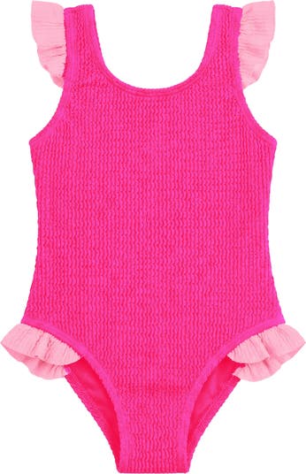 Meet the Lulu Infant/Toddler Crinkle Ruffle One Piece—where summer adventures come to life! This vibrant fuchsia swimsuit features our signature crinkle-textured fabric that's as fun to touch as it is to wear. Designed for active toddlers, it stretches and flexes with every splash, jump, and giggle while providing the comfort they need for endless water play. Adorable ruffle accents at the shoulders and legs add that extra dash of personality. Perfect for making a splash at the pool, beach, or backyard water games!