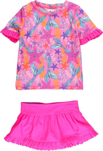 Toddler Girls Short Sleeve Ruffle UPF50+ Rash Guard Skirted 2-Piece