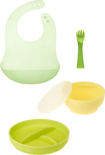 Empower your little one to take the exciting steps toward feeding themselves with this set. It's perfect for engaging your toddler's interest and enthusiasm at mealtime. The set includes a gently divided plate to promote portion control and variety, a durable silicone bowl with a matching lid for convenient meal preparation and storage, and a child-friendly fork that's just the right size for little hands to grip and maneuver. This set is made with food-safe silicone that's not only gentle on tender gums but also incredibly easy to clean, ideal for the messier adventures of toddler meals.