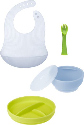 Empower your little one to take the exciting steps toward feeding themselves with this set. It's perfect for engaging your toddler's interest and enthusiasm at mealtime. The set includes a gently divided plate to promote portion control and variety, a durable silicone bowl with a matching lid for convenient meal preparation and storage, and a child-friendly fork that's just the right size for little hands to grip and maneuver. This set is made with food-safe silicone that's not only gentle on tender gums but also incredibly easy to clean, ideal for the messier adventures of toddler meals.