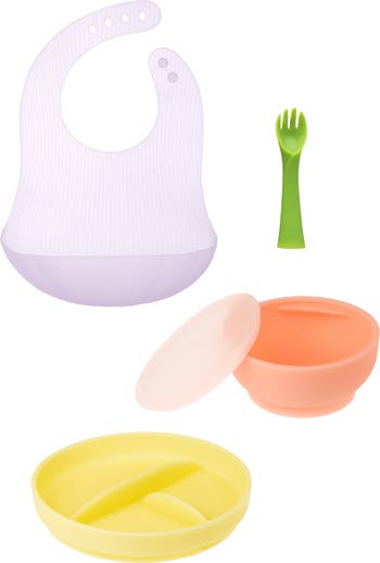 Empower your little one to take the exciting steps toward feeding themselves with this sweet set. It includes a gently divided plate to promote portion control and variety, a durable silicone bowl with a matching lid for convenient meal preparation and storage, and a child-friendly fork that's just the right size for little hands to grip and maneuver. Made entirely from soft, flexible, baby-safe silicone, this set ensures that your child's transition to self-feeding is safe, enjoyable and mess-free.
