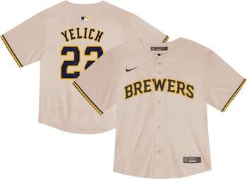 Get your young fan ready to cheer on the Milwaukee Brewers with this Christian Yelich Home Game Jersey from Nike. This officially licensed jersey is constructed with breathable fabric and features heat-applied twill team and player details, ensuring your little one stays cool and comfortable while repping their favorite player. With its full-button front and rounded hem with a satin woven jock tag, this jersey delivers an authentic look that's perfect for game day or any day.