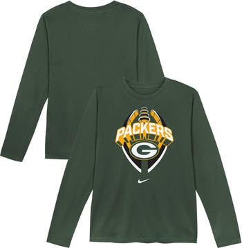 Let your little one showcase their budding Green Bay Packers pride with this Primetime Legend Icon Long Sleeve Performance T-Shirt from Nike. Crafted with Dri-FIT technology, this tee wicks away moisture, keeping your little fan cool and comfortable during playtime. The screen-printed Green Bay Packers graphics boldly display your child's team spirit, making it perfect for game day or everyday wear.