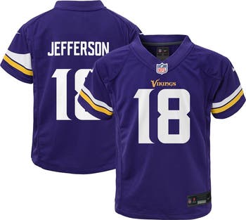 When Justin Jefferson is on the field, opposing teams take notice, so help your youngster show some love for one of the top players in the NFL with this exclusive Minnesota Vikings Game jersey from Nike. Complete with mesh panels for extra breathability, this jersey replicates the authentic one that Justin Jefferson wears every Sunday, giving your young fan the perfect piece of gear for every Minnesota Vikings game this season.