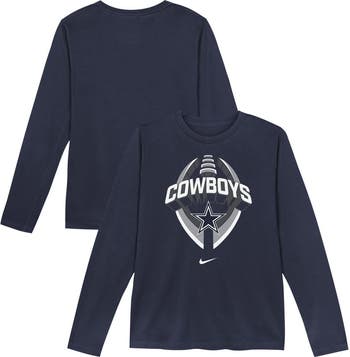 Let your little one showcase their budding Dallas Cowboys pride with this Primetime Legend Icon Long Sleeve Performance T-Shirt from Nike. Crafted with Dri-FIT technology, this tee wicks away moisture, keeping your little fan cool and comfortable during playtime. The screen-printed Dallas Cowboys graphics boldly display your child's team spirit, making it perfect for game day or everyday wear.