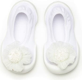- STAY ON: The cotton top wraps the little feet just like comfy socks - easy to put on and take off. Superior elasticity helps keep them on. NATURAL: Non-toxic, BPA Free, ultra-light (32g - size 5), recyclable, 100% TPE (Thermoplastic Elastomer) rubber material (often used in baby teething toys) keeps it both soft and supportive - making it easier to walk and run. BREATHABLE: Tiny holes on the bottom rubber sole, combined with cotton sock top make Komuello wonderfully breathable so no worries for sweaty feet! SLIP RESISTANT: Beehive patterned TPE natural rubber sole is perfect for indoor and outdoor. EXTRA COMFORT: Komuello's patented unique Air Pocket between the sock layer and sole provides extra cushion. WATER SHOES: Perfect as water shoes at the beach, pool or splash pad as Komuello shoes are designed with tiny holes in the rubber soles to allow water to pass through easily and they dry quickly. MACHINE WASHABLE: Got dirty? No problem. Throw them in the washing machine! FLEXIBLE & SUPPORTIVE: Our rubber soles are flexible for easy movement, yet give the right amount of support for arch development. Comfortable to wear all day. WEAR EVERYWHERE: Komuello shoes are perfect for both indoor (home, preschool) and outdoor (park, playground).