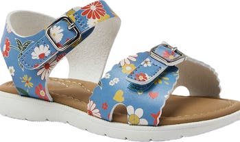 These Easy On Scalloped Sandals for toddler girls are sweet and simple. Nothing is better than a kids' sandal design with adorably charming, scalloped edges. Don't worry about having to help them put these on - they can do it all by themselves with the functional easy-on hook and loop closures concealed behind the metal buckle detailing on both straps. A soft, vegan leather upper and interior lining with padded contoured footbed keep little feet comfortable and cozy throughout the day. Ready for every adventure, your child will love the fun Light Pink or Pale Blue Florals colorway. Kids' toddler shoe sizes range from 5 to 10.