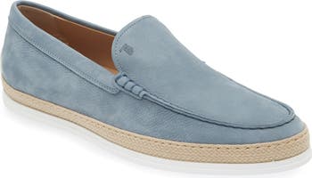 Loafer-inspired styling elevates a casual slip-on sneaker made in Italy from richly textured nubuck leather with a raffia-wrapped rubber sole. A lucky light-blue hue and pebbled grip finish off this functional, fashion-forward style.