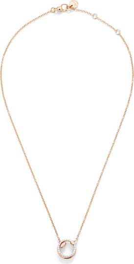This deeply meaningful necklace features a pendant with two circles held together by a link, symbolizing the power of unity and the strength of togetherness. The miniature rose-gold pendant is set with 36 white pavé diamonds, including two sparkling diamond-set gold links. The mobile link allows the chain to slide along the space between the two rings: a tactile reminder of love’s freedom.
