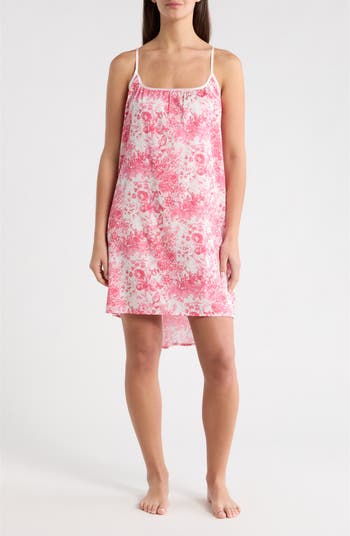 A hand-drawn garden with logo scripts beautifully illustrates this lightweight, breathable cotton chemise framed by dainty straps and a flowy high-low hem.