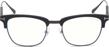 Signature T-bar motifs detail the hinges and temples of semi-rimless glasses crafted in Italy and fitted with lenses that help filter out blue light from screens and devices.