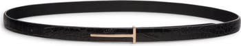 This Italian patent-calfskin belt brings a little edge to your look with crocodile embossing and an elongated T Icon buckle.