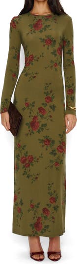 An undone bouquet is scattered across the verdant background of a soft knit dress mostly made from sustainable Tencel™ lyocell.