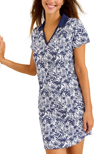 A vibrant tropical prints brings resort vibes to this short-sleeve dress cut from stretchy performance fabric that wicks away moisture and offers sun protection.