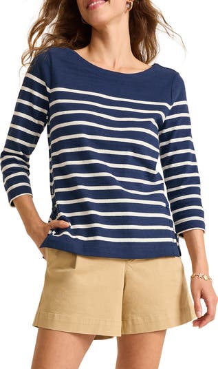 Three-quarter sleeves frame this soft knit top made with a side buttons and nautical stripes.