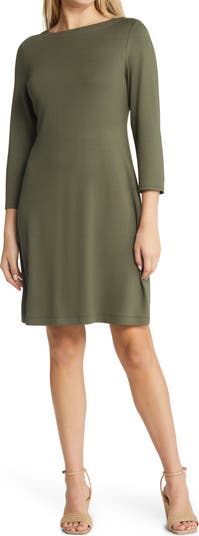 Feel your best no matter what life throws at you in this comfy three-quarter sleeve minidress with plenty of stretch and a zipper in the back.
