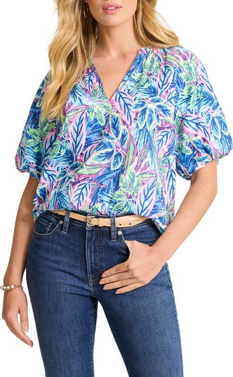 Take on a summery day in a popover top splashed with a lively print and cut from cool cotton.