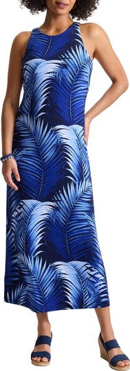 A coastal print patterns this stretch-enhanced maxi dress featuring a built-in shelf bra and sun protection.