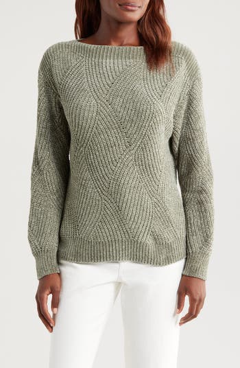 Undulating waves inspire the open-stitch patterning of a soft chenille sweater that furthers the nautical theme with a boat neck.