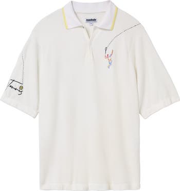 - Chainstitched tennis player and tennis logo, connected by a dotted ball path line that passes seamlessly from the shoulder, across the back and onto the wearer's right sleeve.