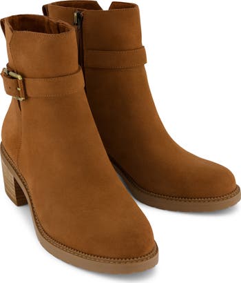 Buckled hardware adds a bit of an edge to a block-heel-lofted bootie made from water-resistant leather and grounded by CloudBound foam cushioning that provides all-day comfort and support.